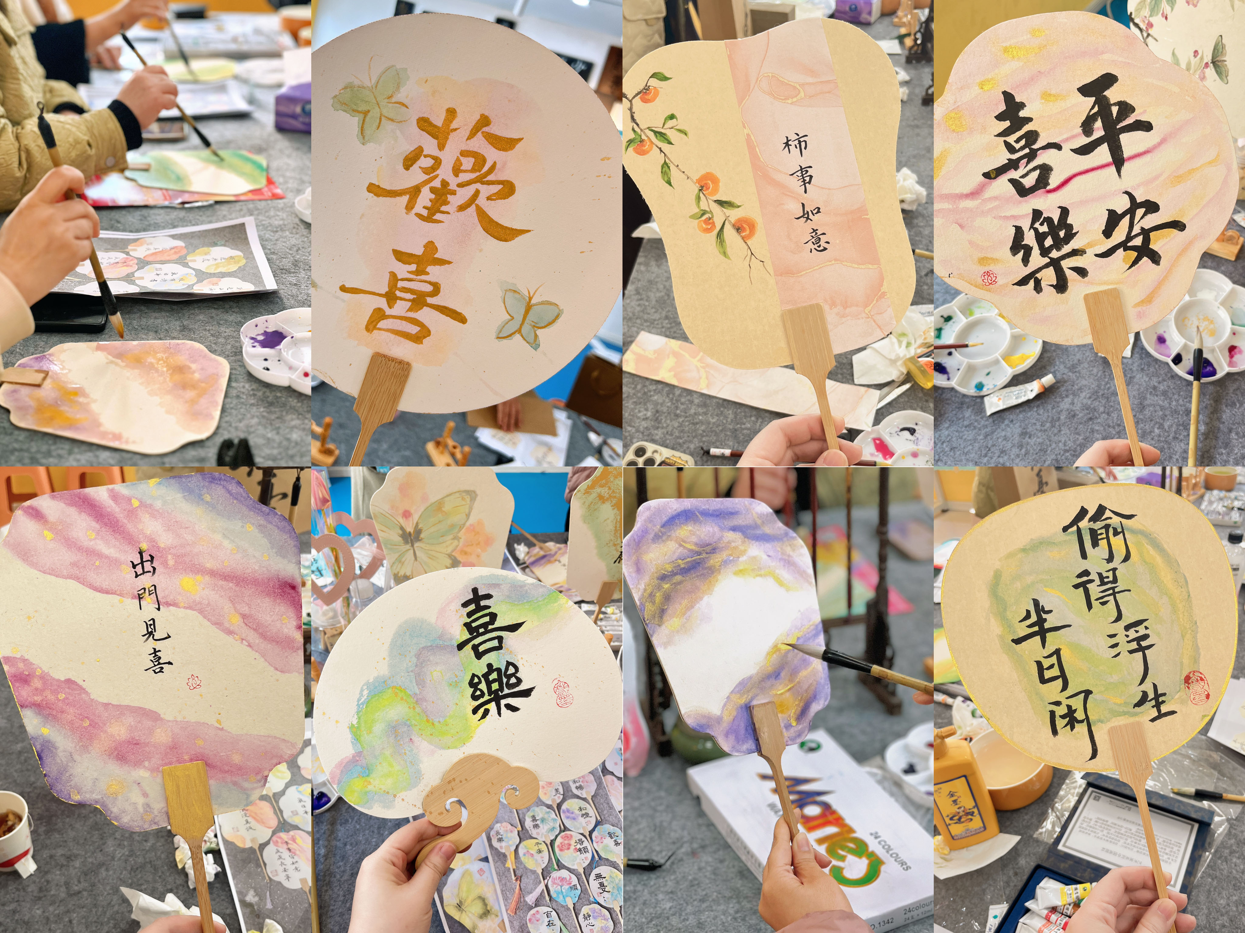 活動開始前,老師先向大家介紹了團扇的文化背景及制作方法。隨后向大家發(fā)放了空白扇子、毛筆和顏料等各種輔料工具。大家躍躍欲試,白描、運筆、上色,忙得不亦樂乎;顒又写蠹覠崆楦邼q,相互借鑒學習,現(xiàn)場充滿歡聲笑語。原本一片空白的團扇,在大家精心制作下變成了一把把色彩斑斕的“藝術品”。